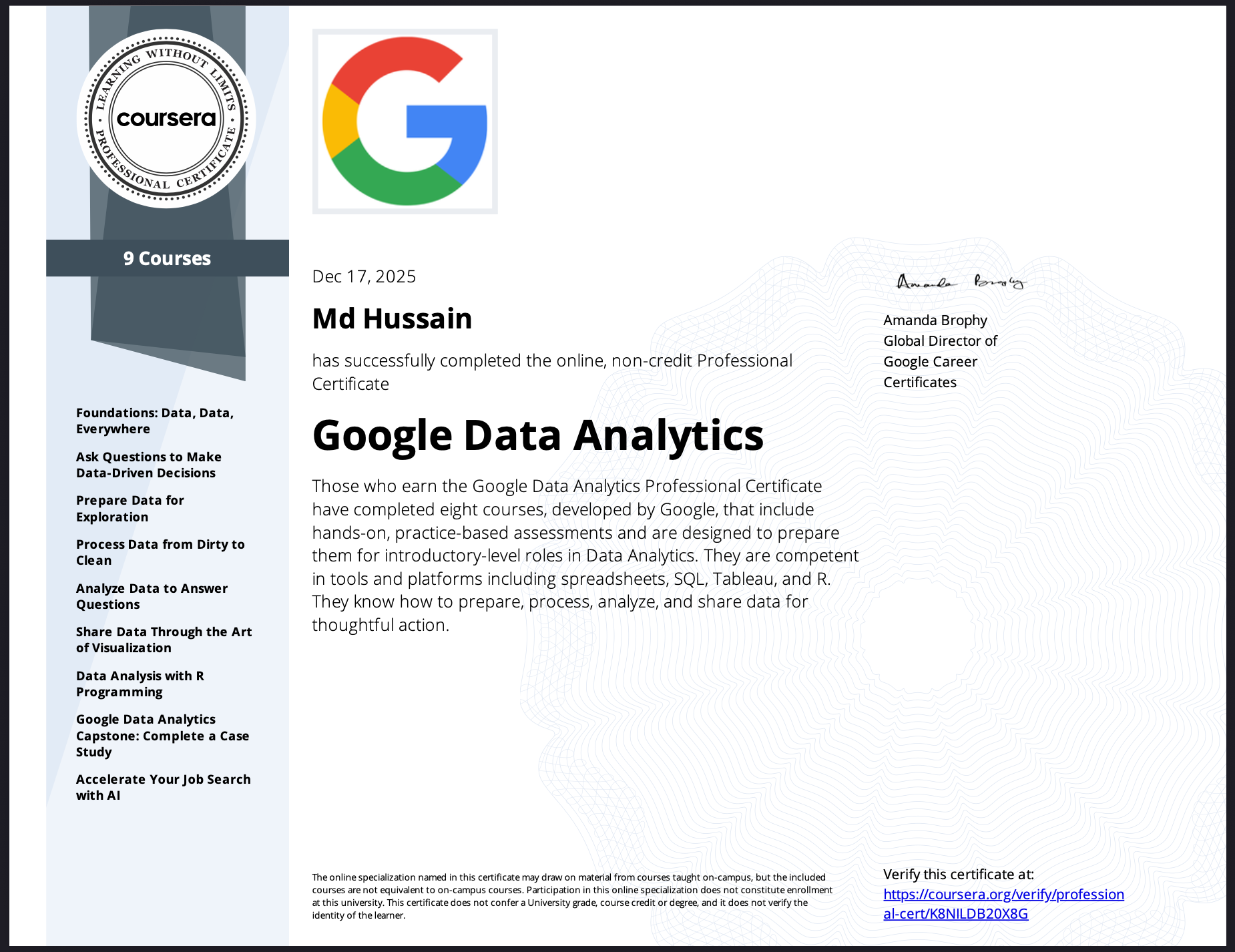 Issued by Google via Coursera